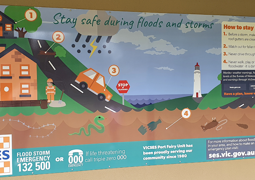 The signage, developed by VICSES, Glenelg Hopkins CMA, Warrnambool City Council, and Moyne Shire Council contains key safety information, emergency phone numbers, local imagery, and a handy QR code that links to online flood resources.